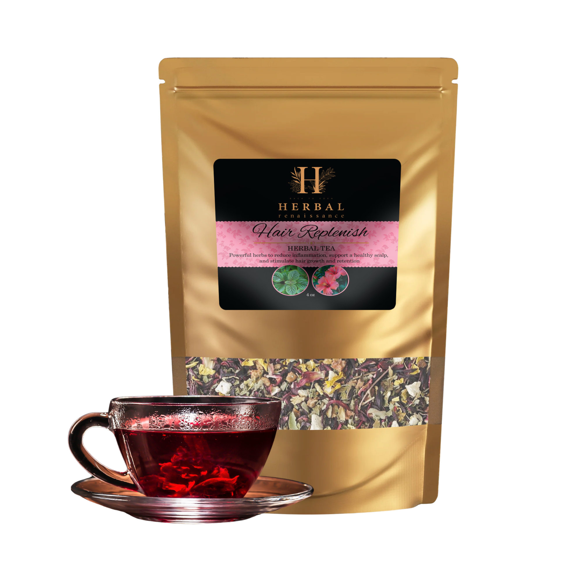 The Hair Replenish tea is a potent combination of anti-inflammatory and follicle nourishing herbs to stimulate and support healthy hair growth and retention. This blend treats the internal state of the body to prevent hair loss, inflammation that causes hair retention issues, and to nourish the body from the inside out to encourage healthy hair growth.